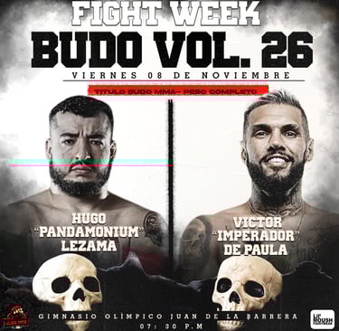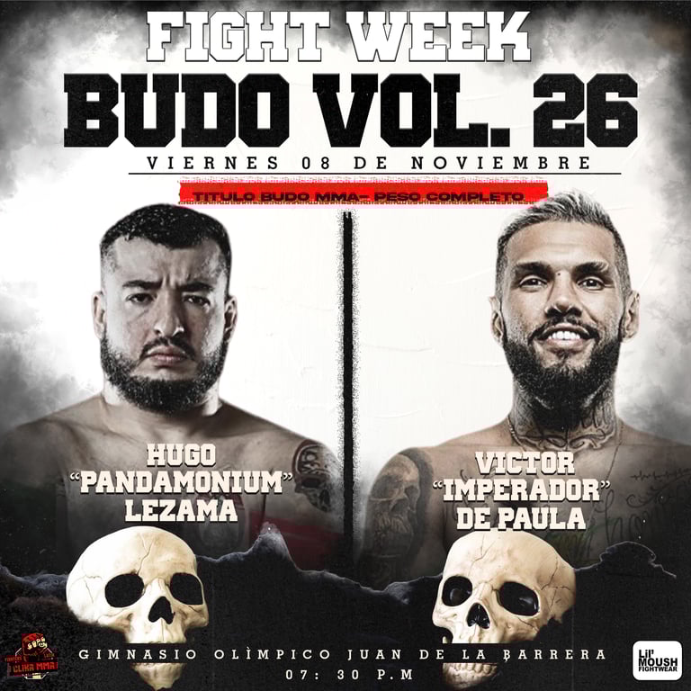 El próximo combate estelar de Budo Vol. 26 enfrenta a dos guerreros que tienen todo por demostrar. Hugo “Pandamonium” Lezama, campeón peso completo de Budo Sento y miembro del reconocido equipo Bonebreakers, defenderá por primera vez su título frente al brasileño Victor “Imperador” De Paula, quien representa al equipo Killer Bees. Para ambos, esta pelea es una oportunidad de redención y de volver a la cima después de sus respectivas derrotas en el pasado.