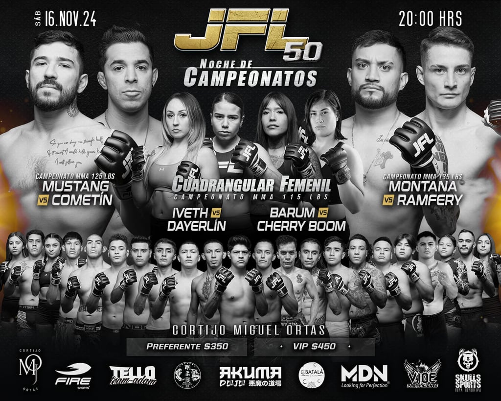 JFL celebra un momento especial en su historia con su evento número 50 el próximo sábado 16 de noviembre, un hito que marca 15 años de peleas, talento y acción ininterrumpida en el mundo de las artes marciales mixtas. En esta edición histórica, JFL trae una cartelera excepcional con dos títulos vacantes en juego en las divisiones de 125 y 135 libras. Además, el evento verá el inicio de un emocionante cuadrangular femenil en la categoría de las 115 libras para coronar a una nueva campeona, consolidando la evolución y el compromiso de JFL con el deporte.