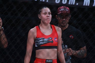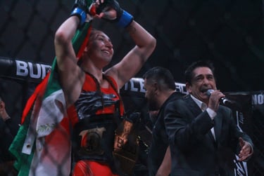 Finalmente, en una pelea de campeonato, Regina 'Kill Bill' Tarín aseguró su lugar en la cima. Se llevó el cinturón de peso gallo con una dominante victoria por TKO, consolidándose como la nueva campeona de Budo. 🏆🔥